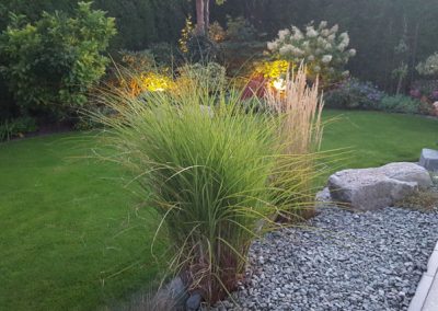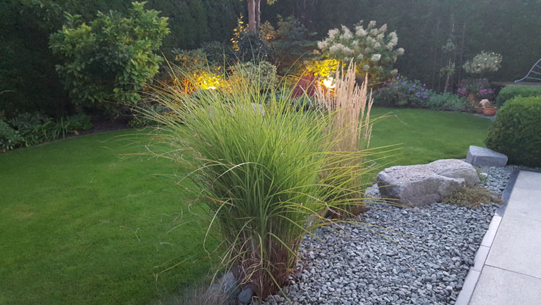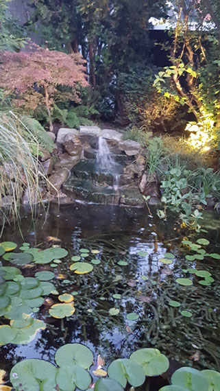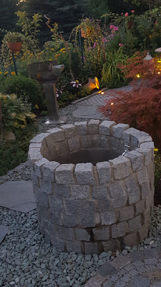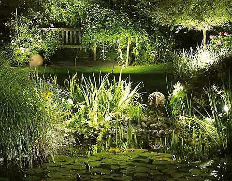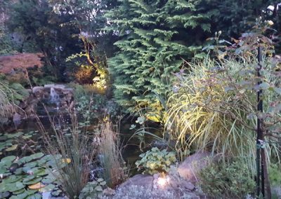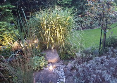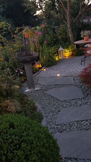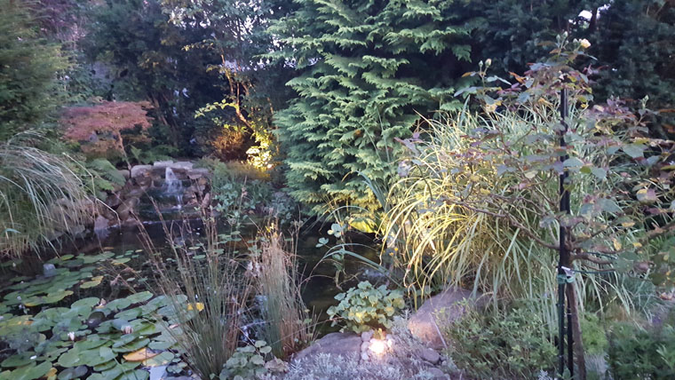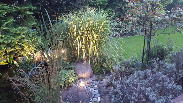 Lichtquellen, wie z.B. ein Moonlight am Gartenteich sorgen für ein wunderschönes Lichtspiel ebenso der beleuchtete Bachlauf.